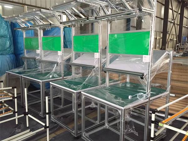 新型的型材是在侧面上有内腔横截面是工字型槽的型材,垂直连接的型材间有弯角连接件和方板形螺母用螺钉相连,可把型材槽底和槽口间的矩形截面的凸棱紧紧夹住,所以连接强度高,拆装方便,铝合金工作台采用优质工业铝型材组装制作而成,坚固的工作桌框架,牢固平稳,定制的工作桌可承重1000kg;可配合各种各样的使用要求,外形美观;层板承重大,可根据客户需要任意组装制作;节约空间,适用性强。